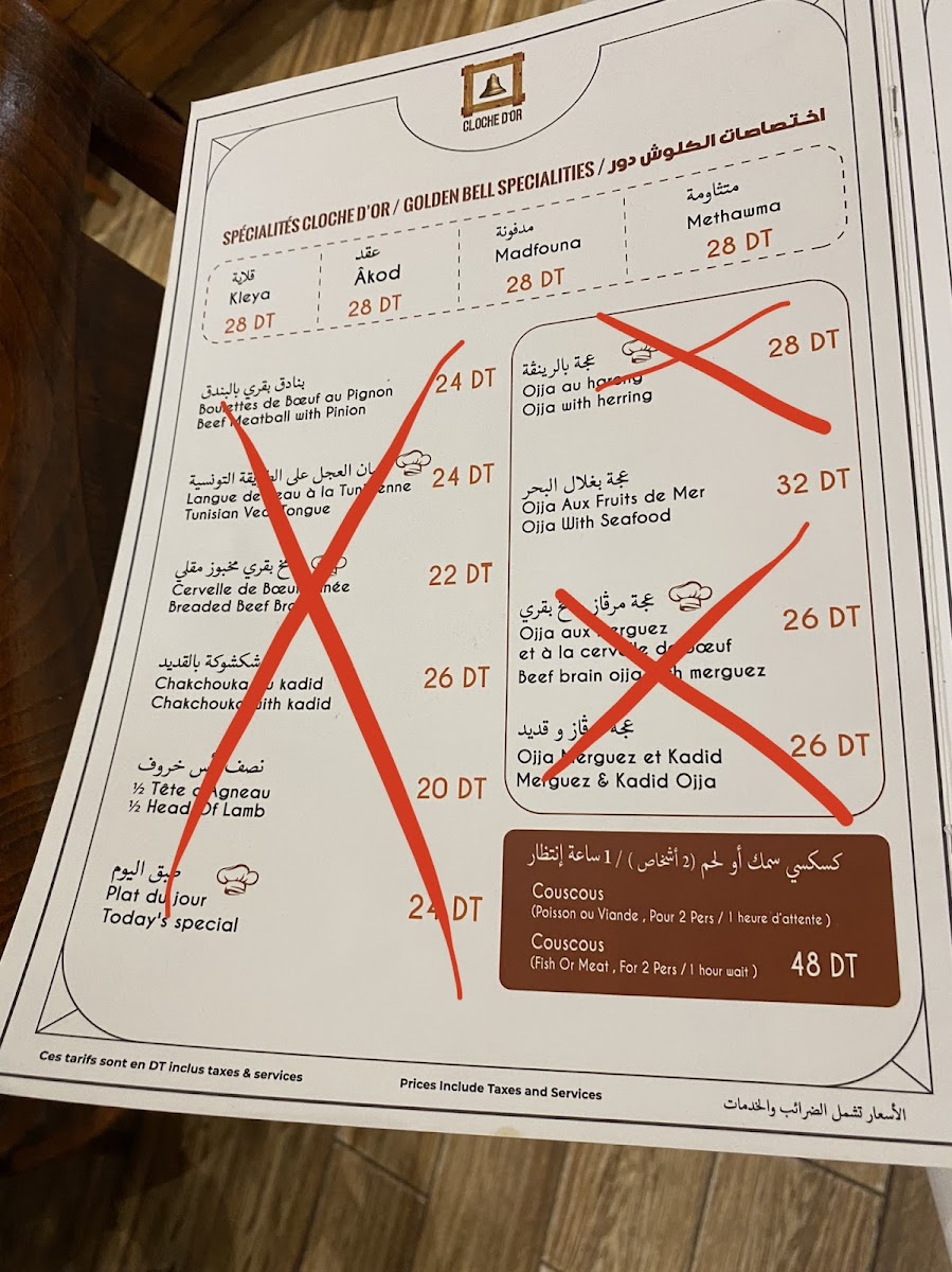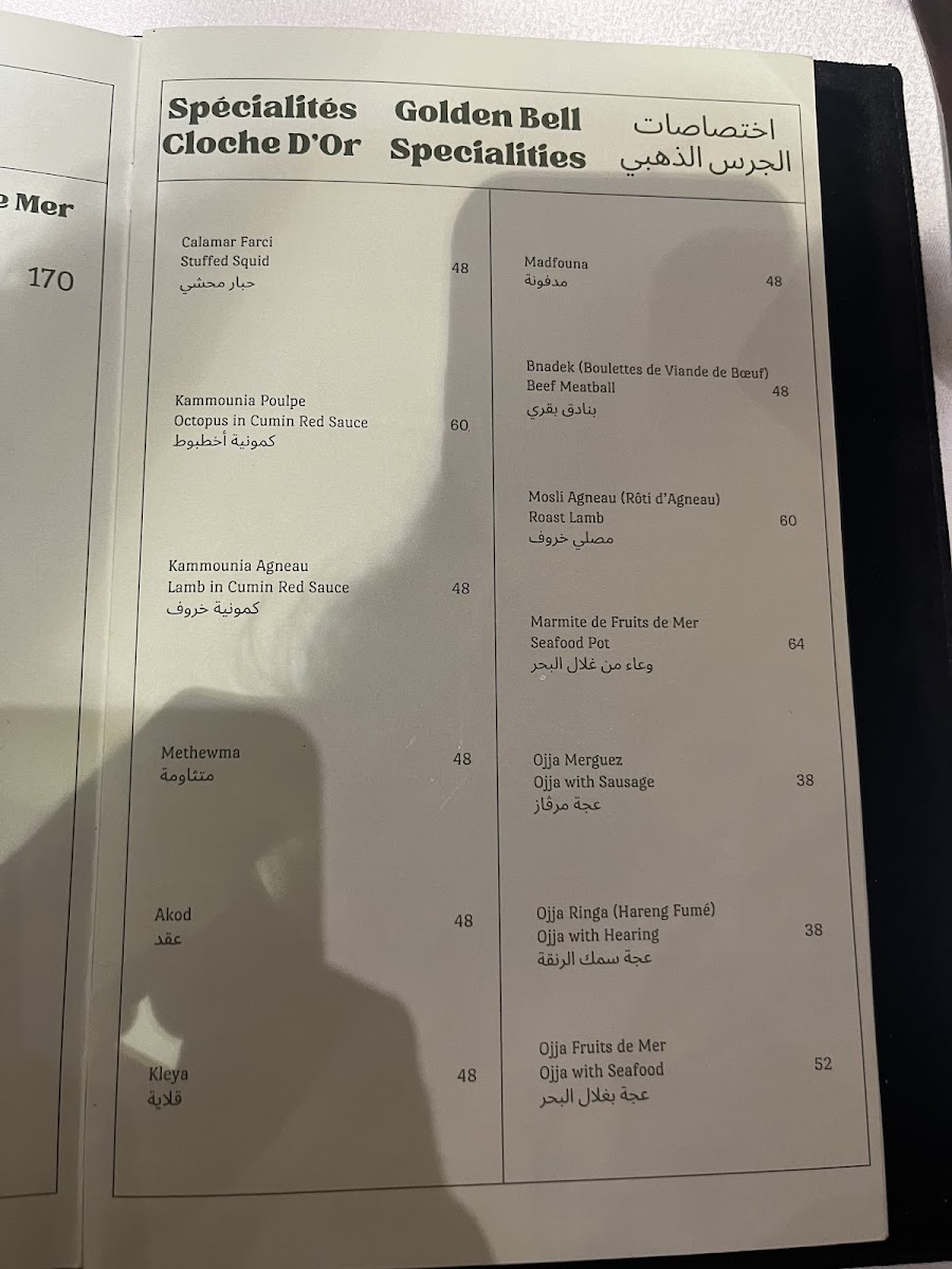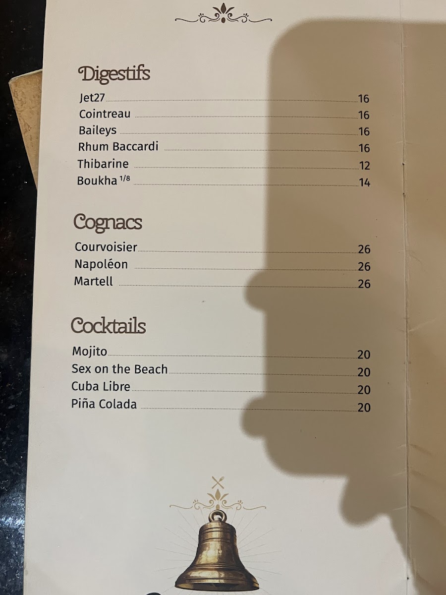 La Cloche D'or offers a diverse and flavorful menu that highlights Tunisian cuisine with a twist of Mediterranean influence. Among the standout dishes is the Grill Mixed, a hearty platter featuring a combination of grilled meats that perfectly captures the essence of Tunisian grilling techniques. For seafood lovers, the Ojja Fruits de Mer stands out with its rich, spiced tomato sauce that complements the fresh seafood, creating a perfect balance of flavors. The Spaghetti À L'encre de Sèche Séch Grillé provides an intriguing option for pasta enthusiasts, combining the distinct taste of squid ink with grilled seafood for a dish that is both savory and visually striking. If you're craving something light yet satisfying, the Fill Fruits de Mer offers a delicate seafood-filled pastry that is a refreshing choice. To end the meal on a sweet note, the Salade de Fruits is a refreshing dessert made from fresh, seasonal fruits that offer a sweet, natural finish to the meal. With its range of vibrant and carefully crafted dishes, La Cloche D'or ensures a delightful dining experience, whether you're in the mood for grilled meats, seafood, or a light dessert.