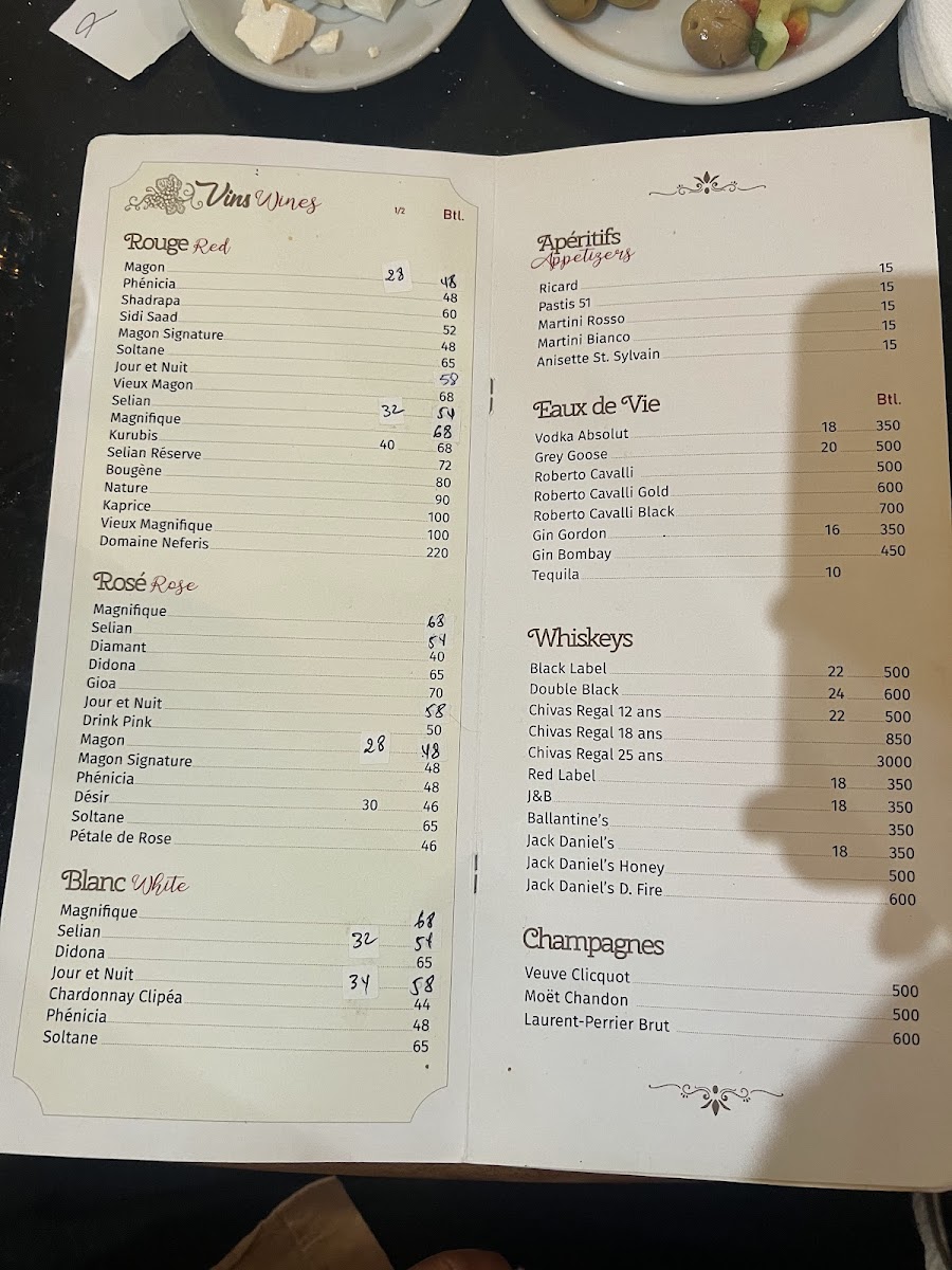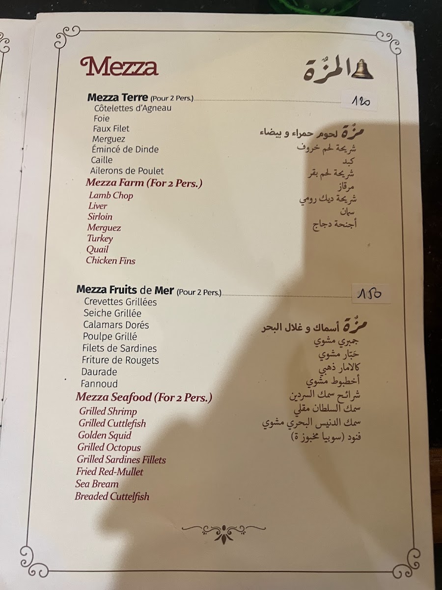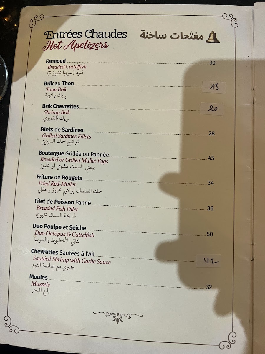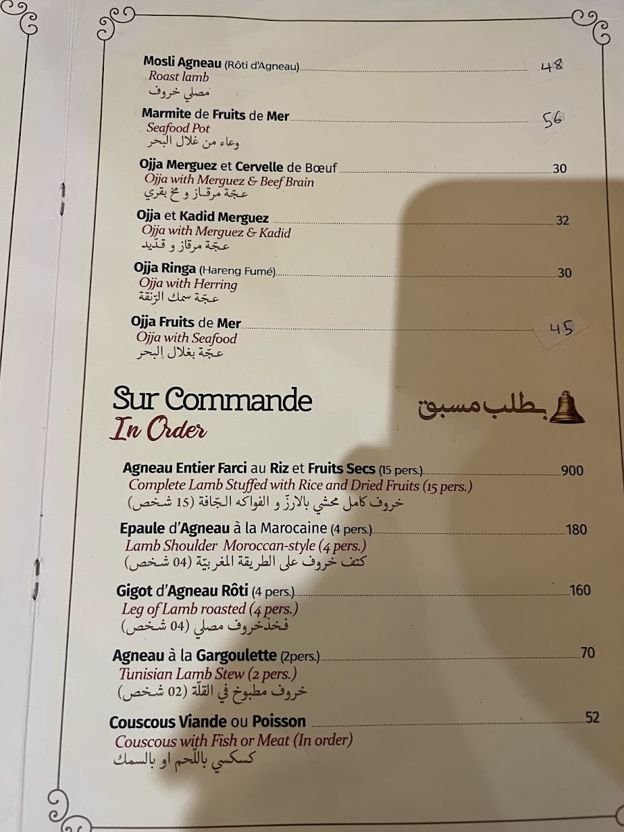 La Cloche D'or offers a diverse and flavorful menu that highlights Tunisian cuisine with a twist of Mediterranean influence. Among the standout dishes is the Grill Mixed, a hearty platter featuring a combination of grilled meats that perfectly captures the essence of Tunisian grilling techniques. For seafood lovers, the Ojja Fruits de Mer stands out with its rich, spiced tomato sauce that complements the fresh seafood, creating a perfect balance of flavors. The Spaghetti À L'encre de Sèche Séch Grillé provides an intriguing option for pasta enthusiasts, combining the distinct taste of squid ink with grilled seafood for a dish that is both savory and visually striking. If you're craving something light yet satisfying, the Fill Fruits de Mer offers a delicate seafood-filled pastry that is a refreshing choice. To end the meal on a sweet note, the Salade de Fruits is a refreshing dessert made from fresh, seasonal fruits that offer a sweet, natural finish to the meal. With its range of vibrant and carefully crafted dishes, La Cloche D'or ensures a delightful dining experience, whether you're in the mood for grilled meats, seafood, or a light dessert.